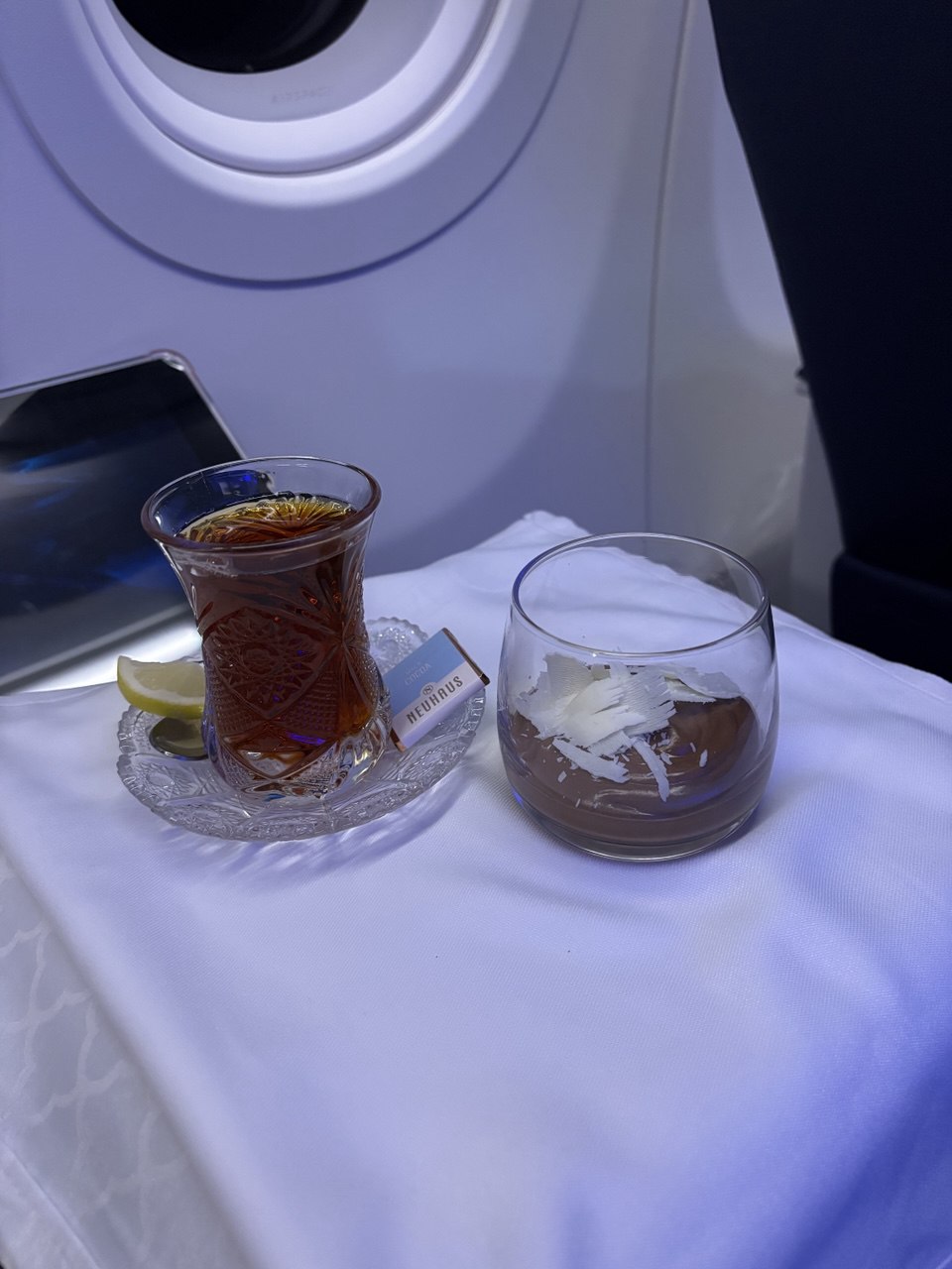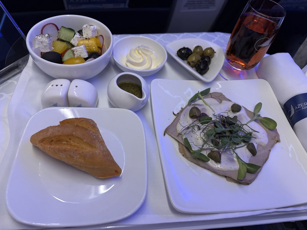 I ordered the chicken cutlet, but honestly, the appetizers were so filling and delicious that I couldn’t finish the main course. I ended my meal with a cup of Azerbaijani tea and a chocolate dessert, which was the perfect way to wrap up the flight.